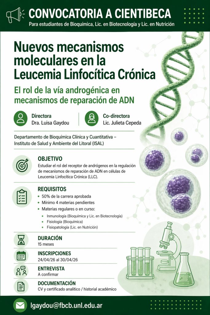 Se encuentra disponible una oportunidad para alumnos/as de las carreras de Bioquímica, Lic. en Biotecnología o Lic. en Nutrición para realizar una cientibeca en el grupo de Biomarcadores, bajo la dirección de la Dra. Luisa Gaydou y co-dirección de la Lic. Julieta Cepeda.