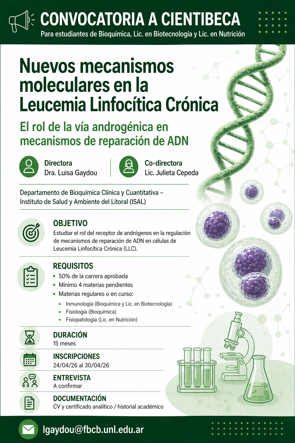 Tema de la actividad: Evaluar el rol del receptor de andrógenos en células mononucleares de sangre periférica (CMSP) de pacientes con Leucemia Linfocítica Crónica (LLC), y dilucidar su impacto en los mecanismos moleculares asociados a la reparación del ADN que se encuentran alterados en la patología. El proyecto busca identificar mecanismos innovadores que potencien el diagnóstico, pronóstico y manejo clínico de la LLC.